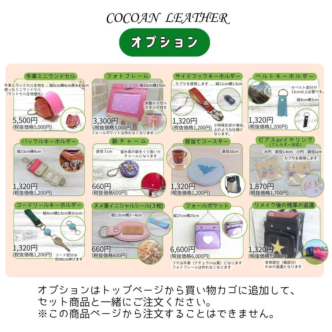 ・オプションは「オプション」ページから買い物カゴに別途で追加して、セット商品と一緒にご注文ください。(トップページ⇒ランドセルリメイク⇒オプション)