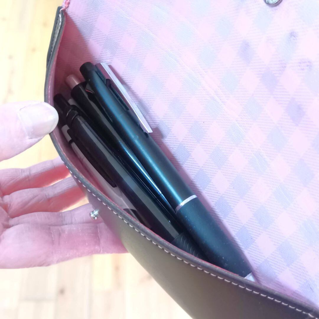 ペンケースは、ペンが4、5本と消しゴム、定規が入ります。