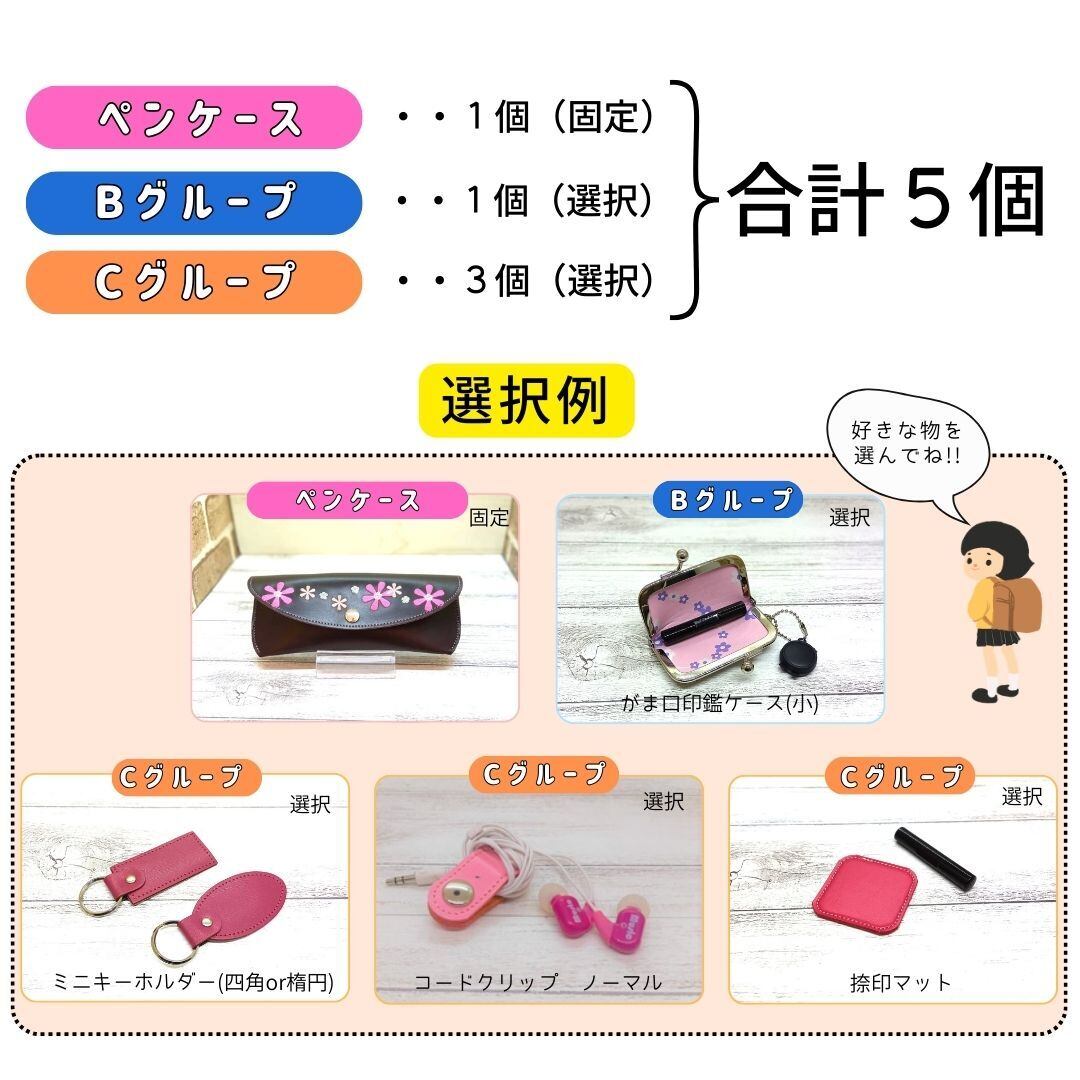 シンプルなペンケース、Bグループから1個選択、Cグループから3個選択の5点セット商品になります。