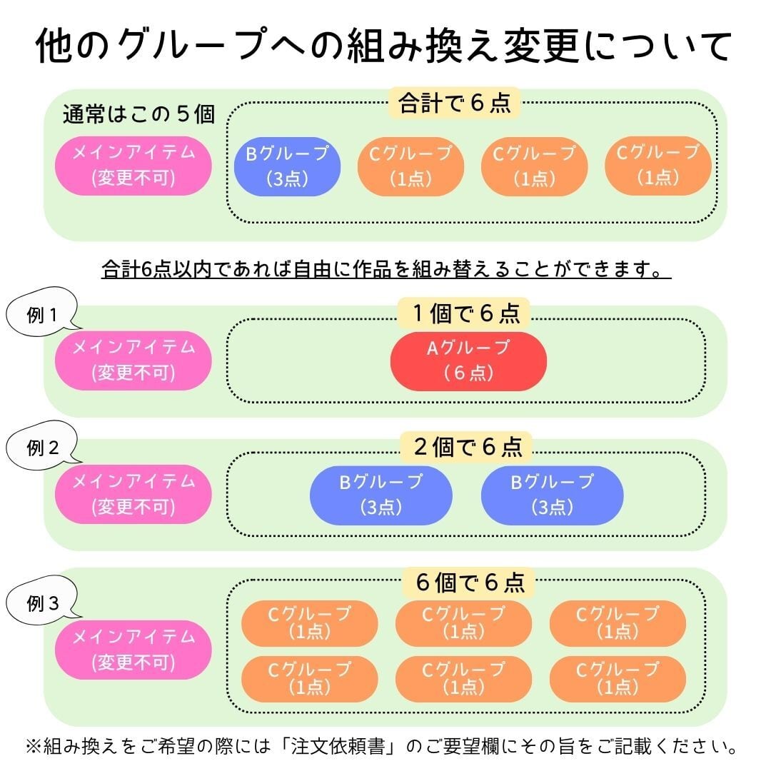 ・同梱される場合、区別できるように色、特徴等を注文依頼書にご記載ください。完成品も区別できるようにして発送致します。